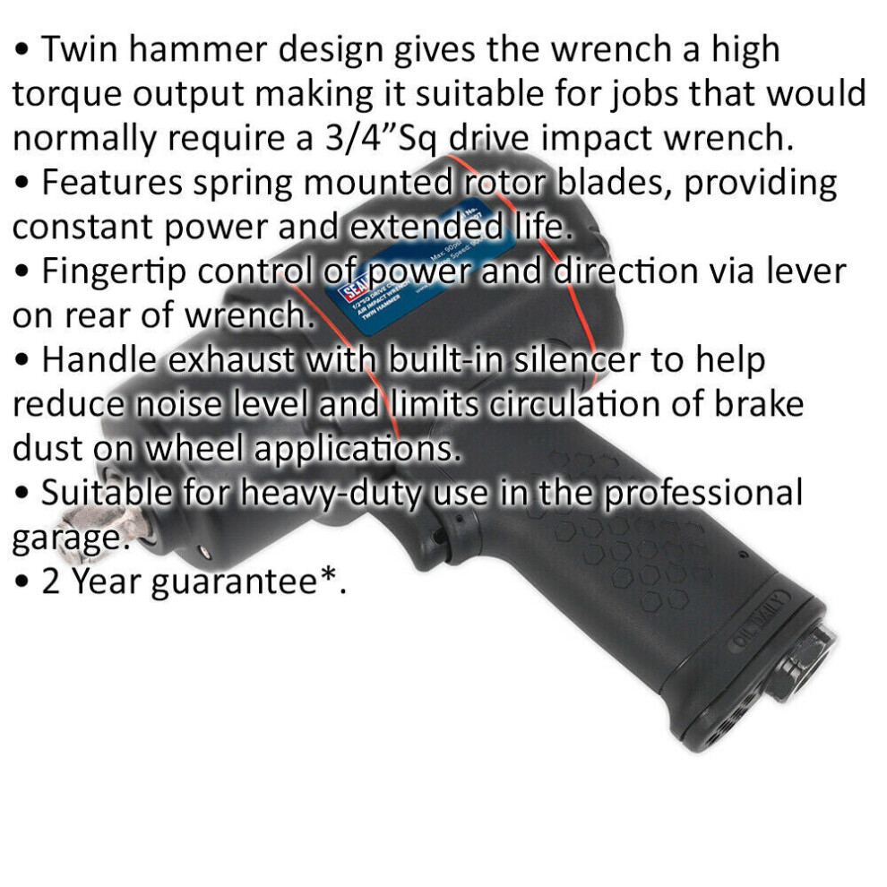 • Twin hammer design gives the wrench a high torque output making it suitable for jobs that would normally require a 3/4"Sq drive impact wrench.